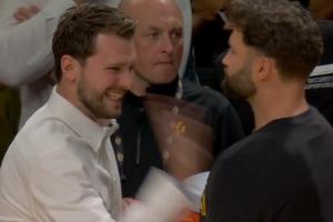 下一篇: 身穿白衬的东契奇在暂停时向队友要球拍一拍 ESPN:他想打球😔